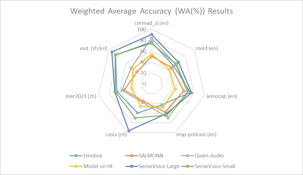 Furthermore, we compared multiple open-source speech emotion recognition models on the test sets, and the results indicate that the SenseVoice-Large model achieved the best performance on nearly all datasets, while the SenseVoice-Small model also surpassed other open-source models on the majority of the datasets.