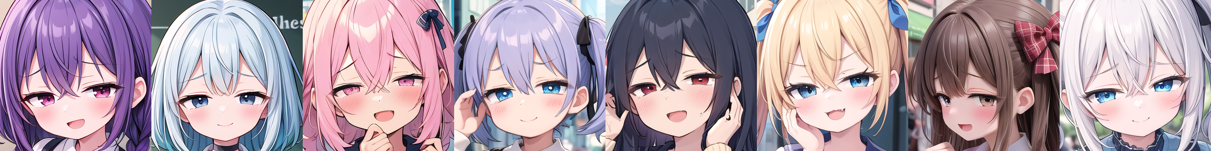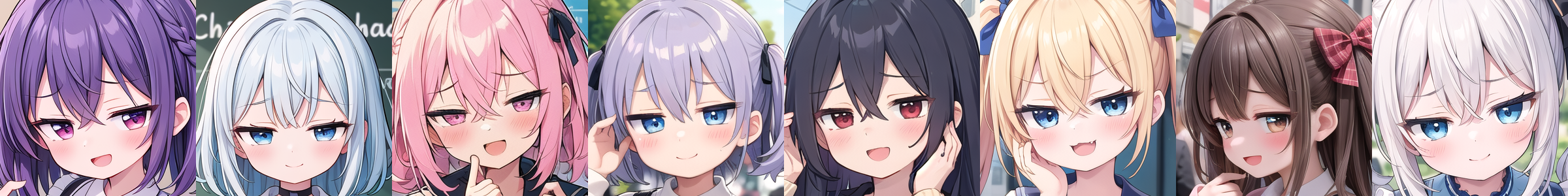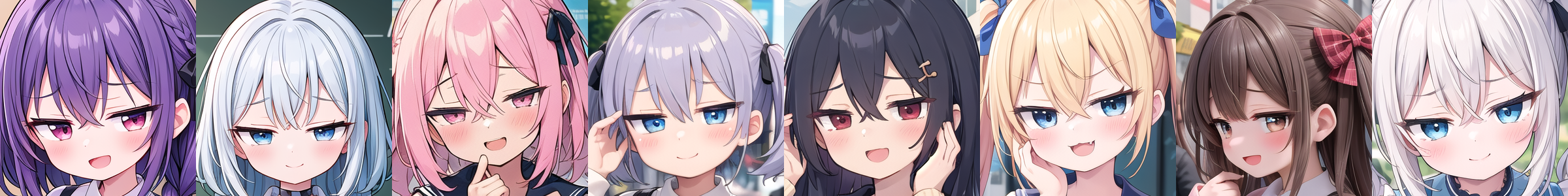 複数タイプを同時に適用したり、[アイコレクション](https://huggingface.co/JujoHotaru/lora/blob/main/eyecolle_preview/README.md)と同時に適用することで眼の形をさらにカスタマイズすることもできます。この場合、それぞれのLoRAの強度は応分(2つなら0.5ずつにするなど)してください。