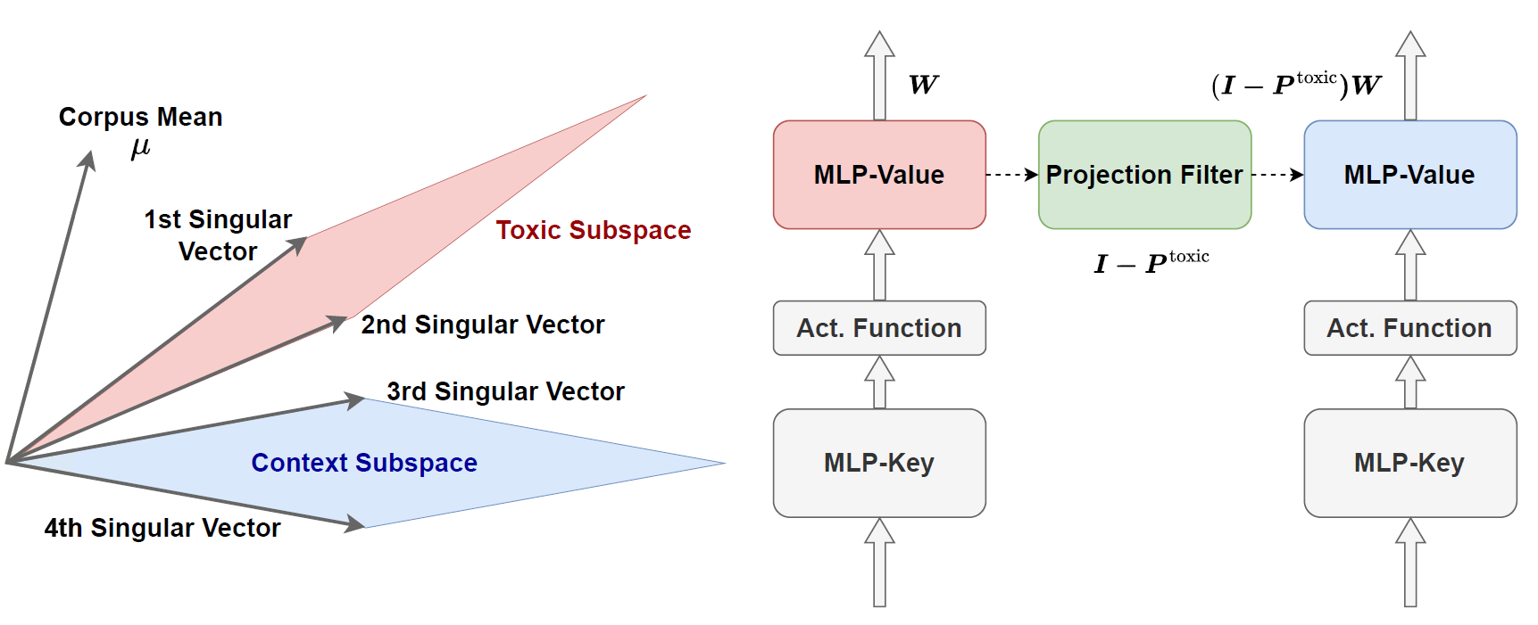 Figure. Schematic of ProFS (previously called DeTox). Toxic directions (in red) are projected out of the model’s MLP-value matrices, leaving other representational directions intact.