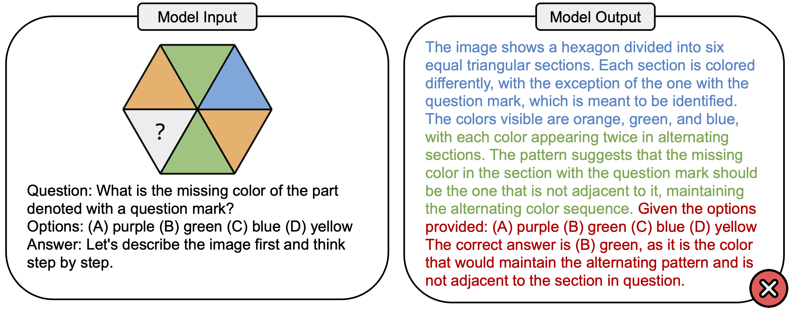 The figure below shows an example question which involves the color concept in PuzzleVQA, and an incorrect answer from GPT-4V. There are generally three stages that can be observed in the solving process: visual perception (blue), inductive reasoning (green), and deductive reasoning (red). Here, the visual perception was incomplete, causing a mistake during deductive reasoning.